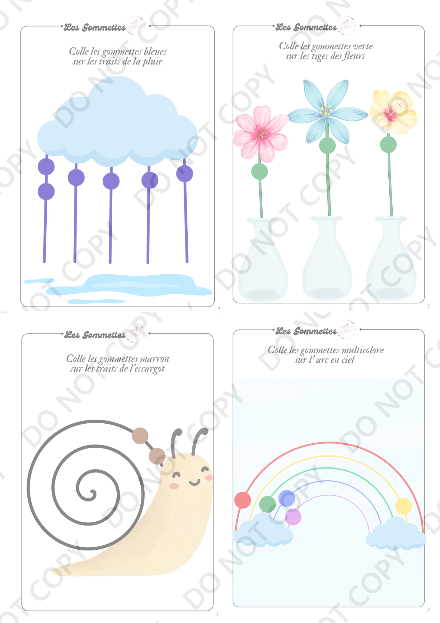 L’enfant doit coller les gommettes sur des lignes et tracés variés. Cela l’aide à développer sa précision et son autonomie tout en s’amusant.